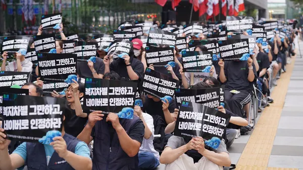 이달 11일 민주노총 화섬식품노조 네이버지회(공동성명)가 경기 성남시 분당구 네이버 본사 앞에서 이른바 사내 하청으로 불리는 6개 손자회사의 처우 개선을 요구하며 쟁의 활동을 진행했다. /사진= 민주노총 화섬식품노조 네이버지회(공동성명)