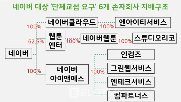 25일 네이버 노조에 따르면 노조는 이달 27일 네이버 손자회사 6개 법인의 처우 개선을 요구하는 쟁의를 진행한다. △그린웹서비스 △스튜디오리코 △엔아이티서비스 △엔테크서비스 △인컴즈 △컴파트너스 등 네이버의 6개 손자회사의 임금과 복지 수준이 네이버 본사에 크게 못 미치는 차별이 지속됐다는 지적이다. 네이버는 △네이버클라우드 △네이버웹툰 △네이버아이앤에스 등 자회사를 통해 6개 손자회사를 100% 지배하고 있다. 본사인 네이버가 전 계열사의 경영 방향과 임금·복지 수준을 실질적으로 결정했기 때문에 차별 책임을 지라는 것이 골자다.