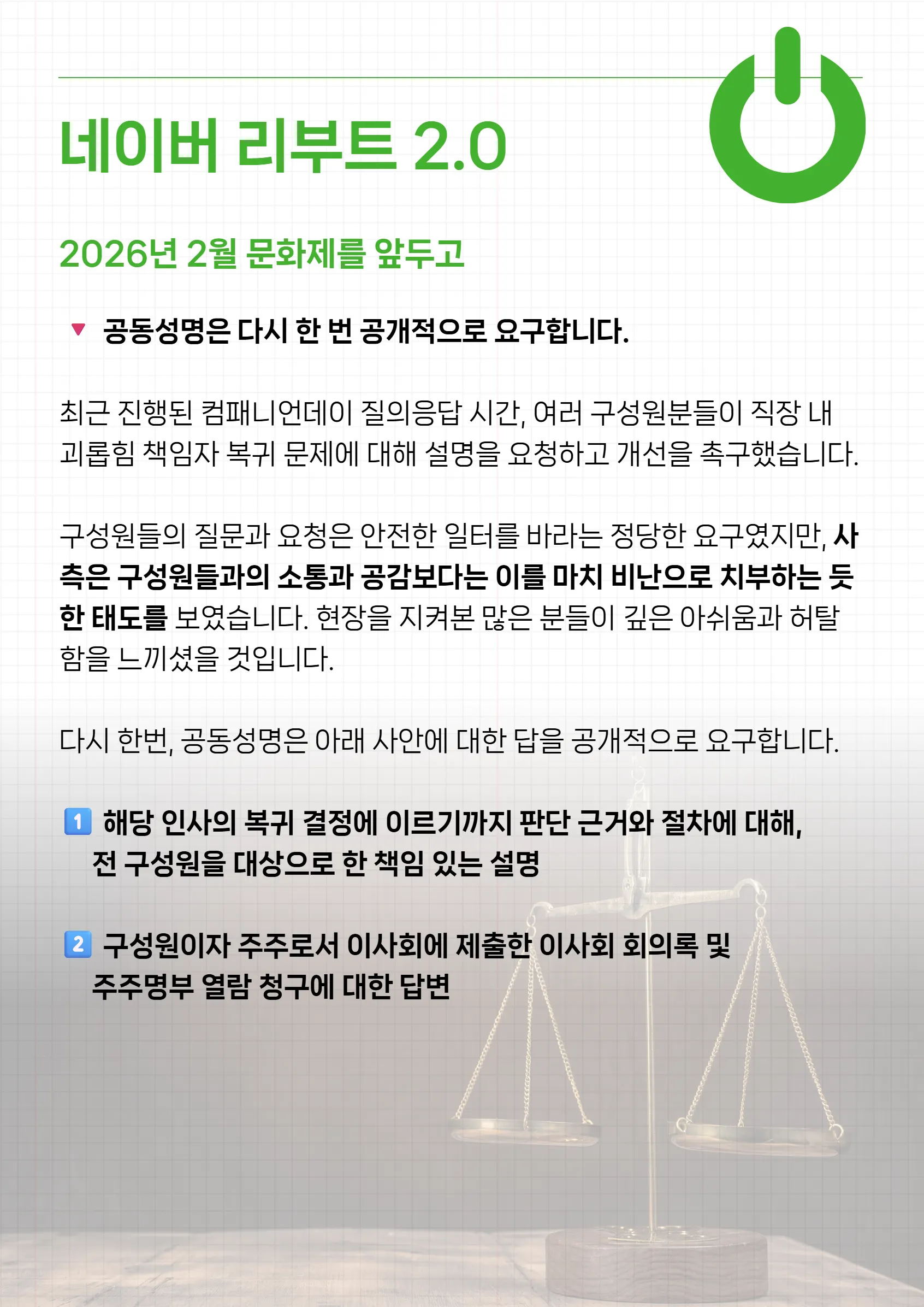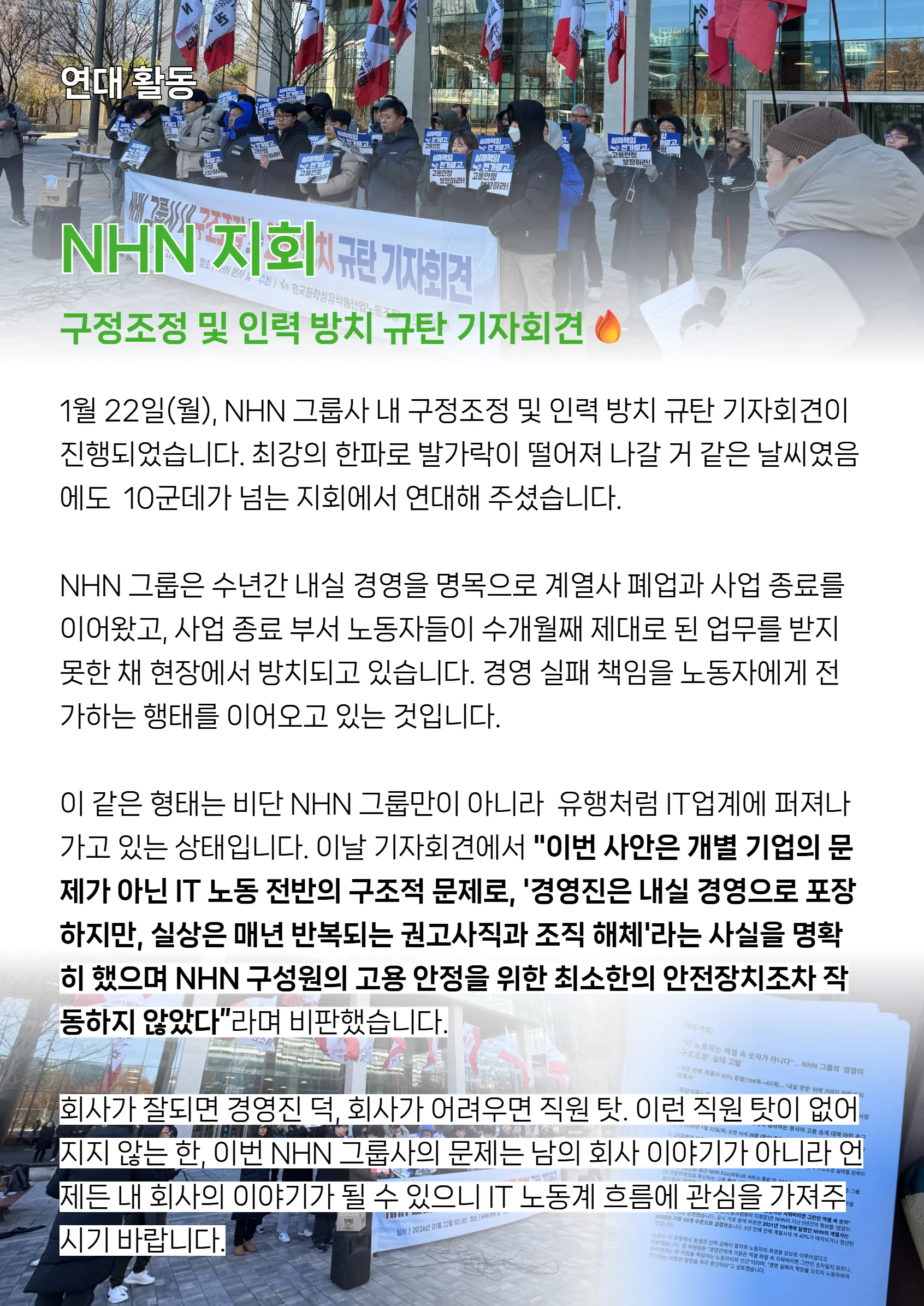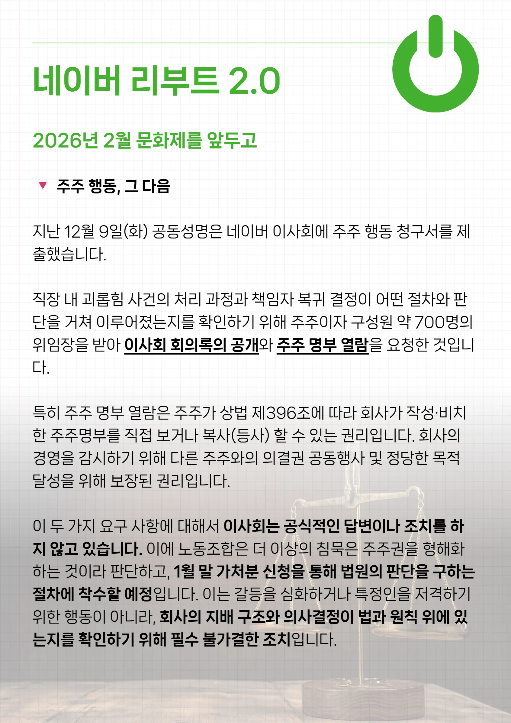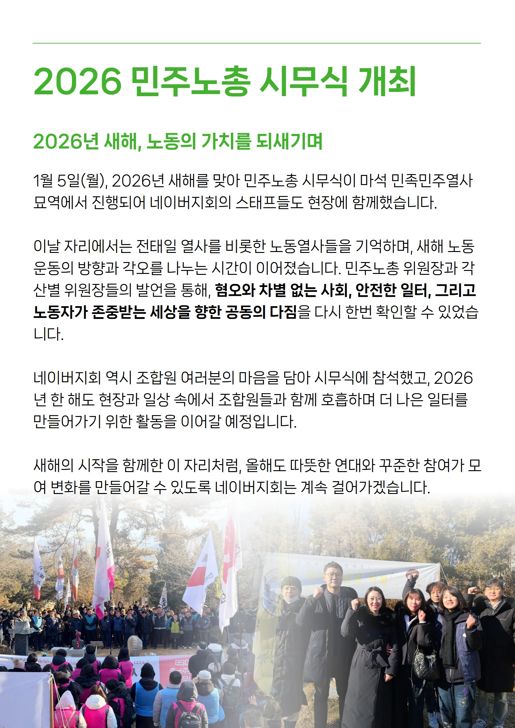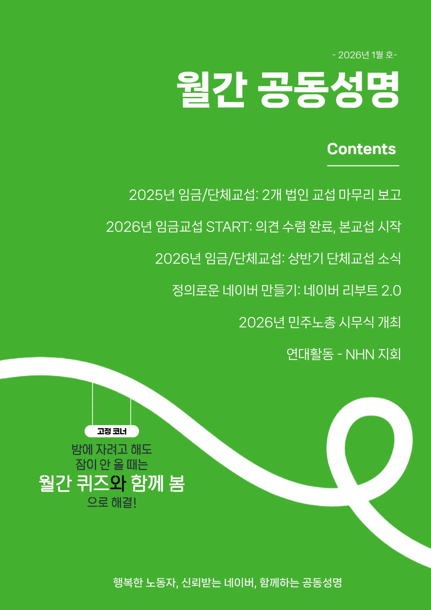 올해는 노동 관련 재판 이슈부터 제도 변화까지, 우리를 둘러싼 환경이 많이 급변할 것으로 예상합니다. 하지만 겁먹을 필요는 없습니다. 옆자리 동료와 맞잡은 손이 있다면, 그 어떤 변화도 우리에게 유리한 쪽으로 끌어올 수 있으니까요.