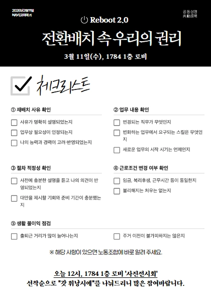 3월의 리부트 2.0 문화제 주제는 ‘전환배치’였습니다. 우리에게는 조직개편이라는 이름으로 더 익숙한 '전환배치'는 회사가 일방적으로 통보할 사안이 아니라, 당사자인 나와 사전 협의하고 공정한 절차를 거쳐 결정되어야 할 문제입니다.
